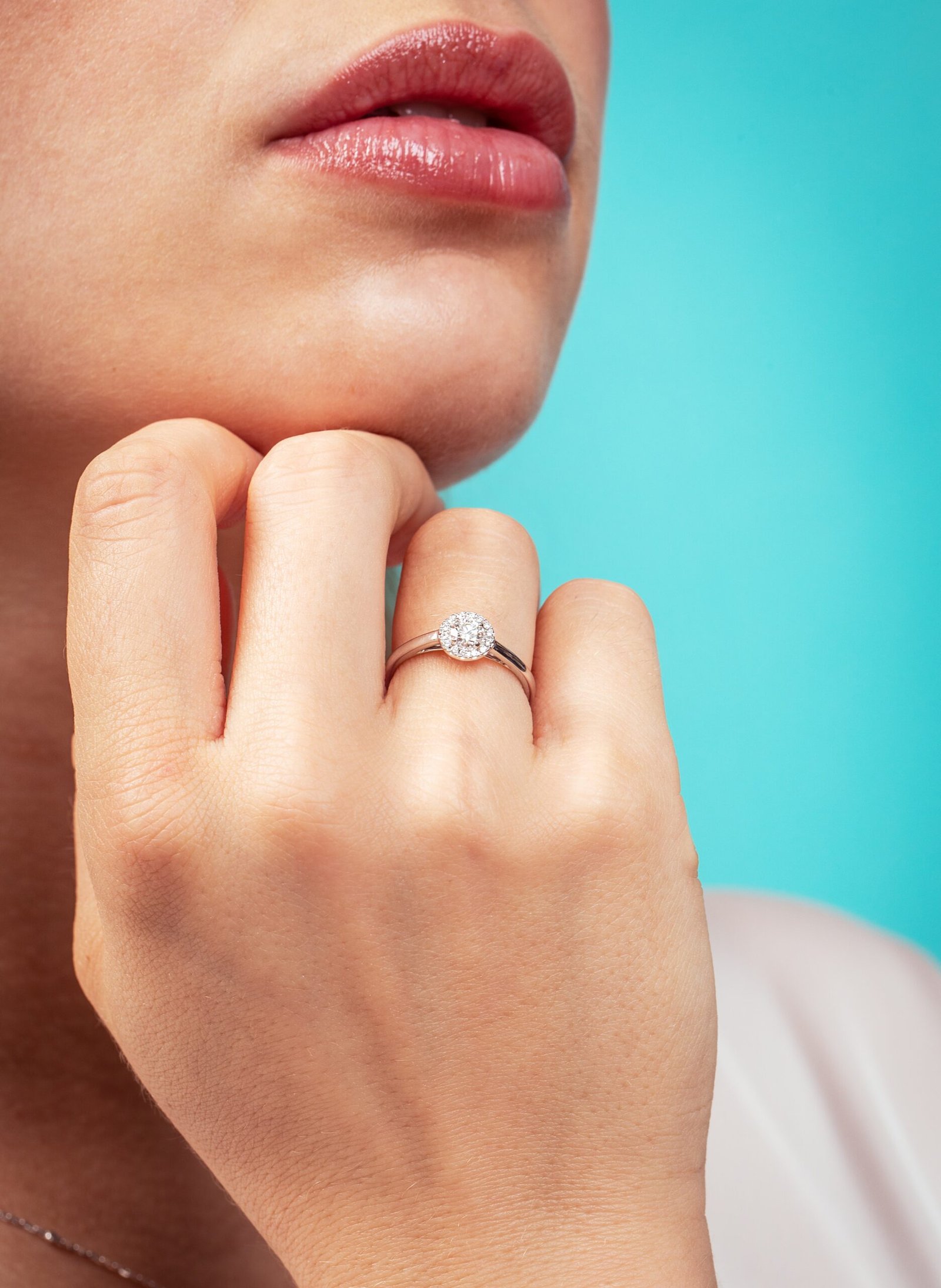 At its center, a brilliant natural white Diamond is delicately enhanced by a halo of natural white Diamonds, creating a soft, radiant sparkle.