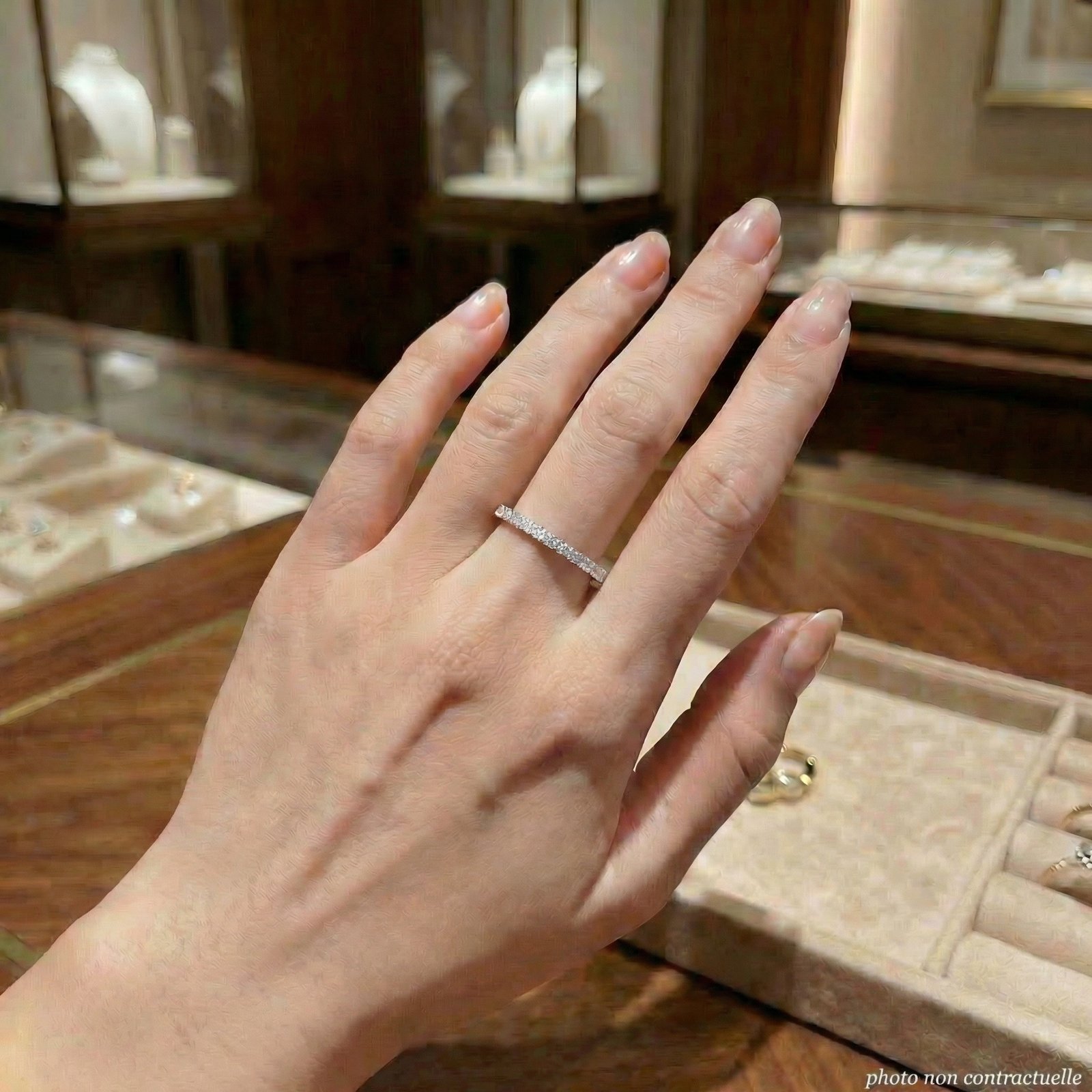 Perfectly White est une bague qu’on porte sans y penser : un anneau fin en or blanc 18 carats, délicatement serti de diamants blancs naturels, pensé pour capter la lumière à chaque mouvement.