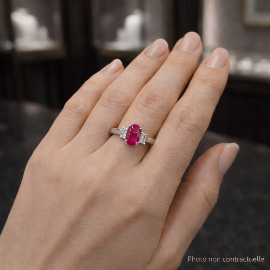 Two baguette-cut natural white Diamonds bring a clean, elegant line on each side, enhancing the Ruby’s rich color with a discreet sparkle.